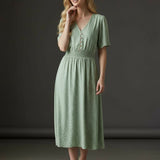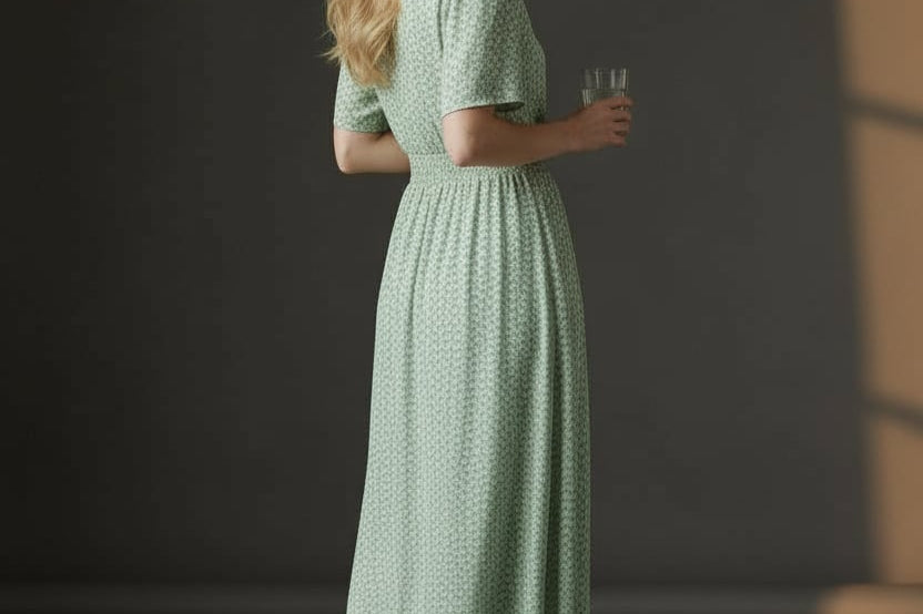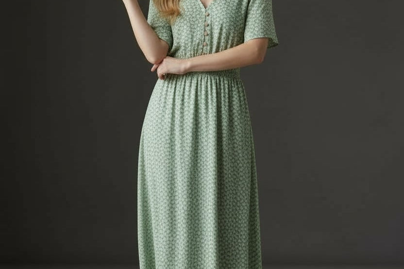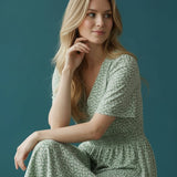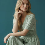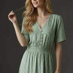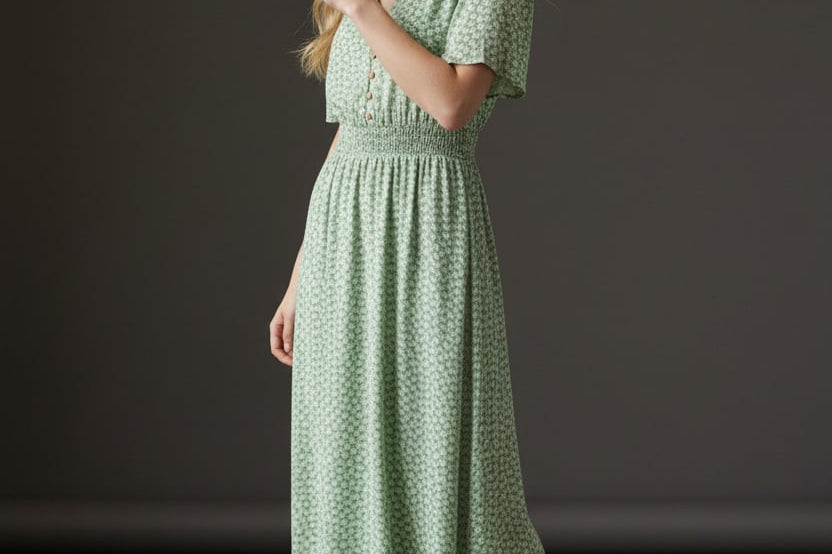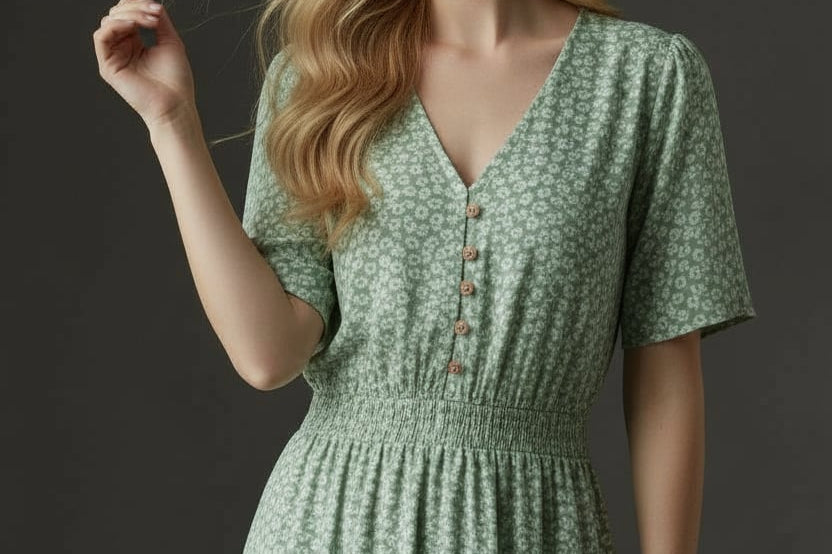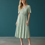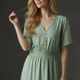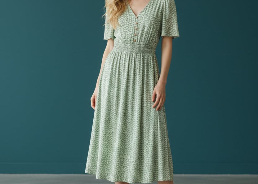 Soft, sweet, and made for sunshine. This flutter-sleeve midi features a delicate green floral print and a beautifully smocked waist that flatters your shape effortlessly. The V-neckline adds a touch of romance, while the flowy skirt gives you movement with every step. Perfect for brunch dates, spring escapes, and any moment you want to feel naturally pretty.