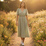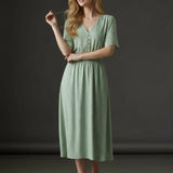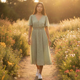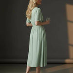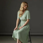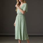 V-Neckline Short Sleeves Shirred Waist Subtle Pleated Skirt
