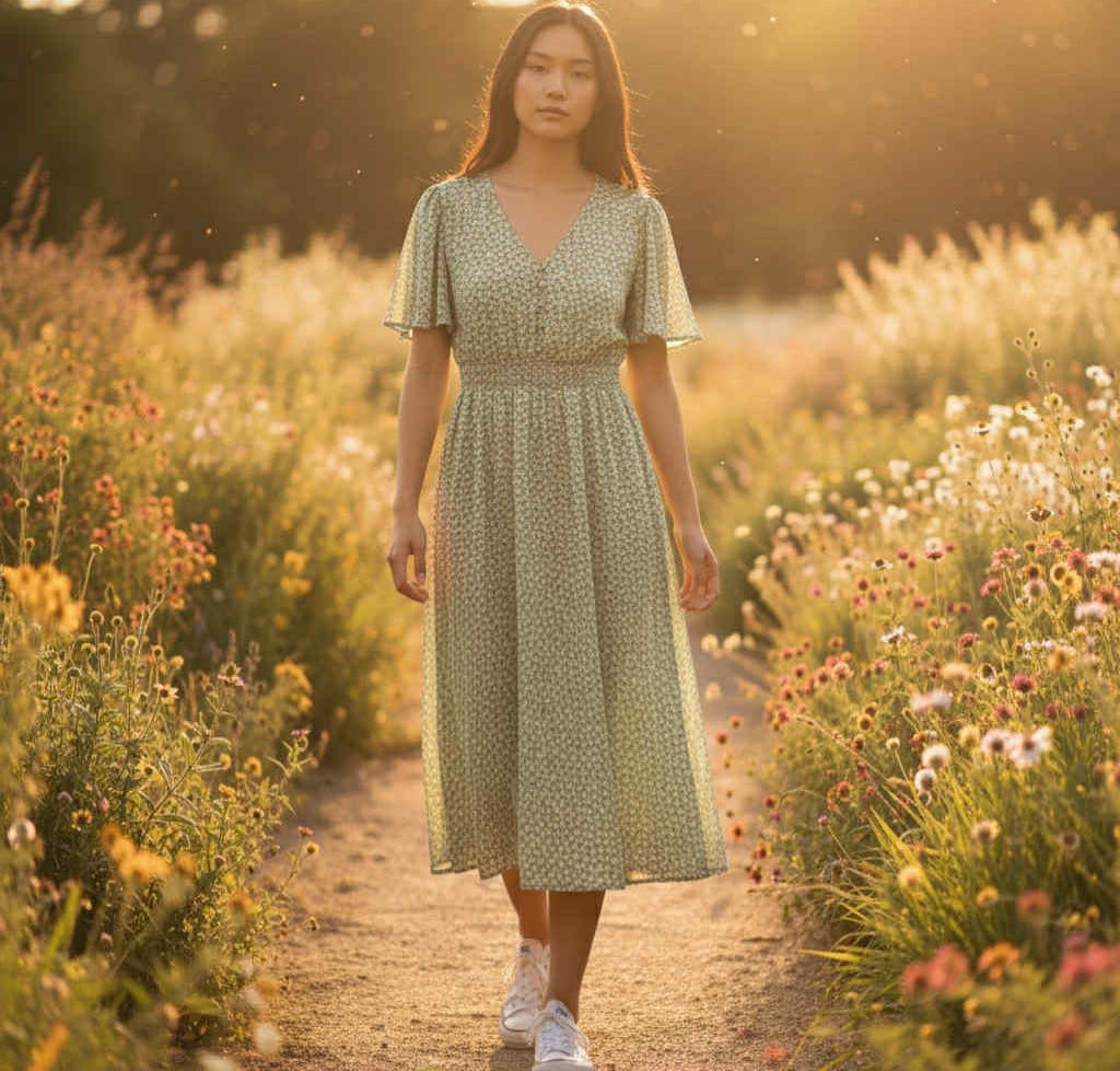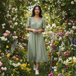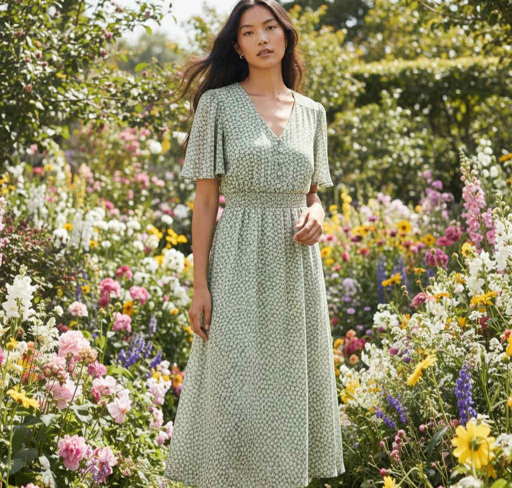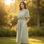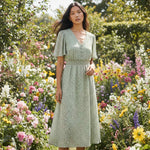 Feel fierce in florals this season with our elegant midi dress. Cut from a cool soft fabric, this flattering piece is detailed with a shirred silhouette that brings in the waist for a fit and flare shape. Pairing the timeless shape with a stylish v-neckline and short angel sleeves makes this dress the perfect option for a Summer’s day. Wear this piece with heeled wedges for a dressy Summer's day!