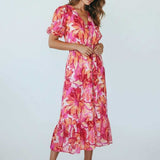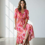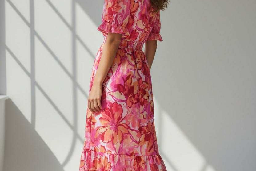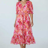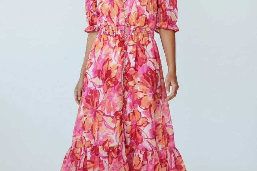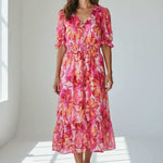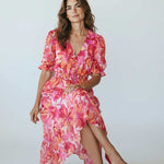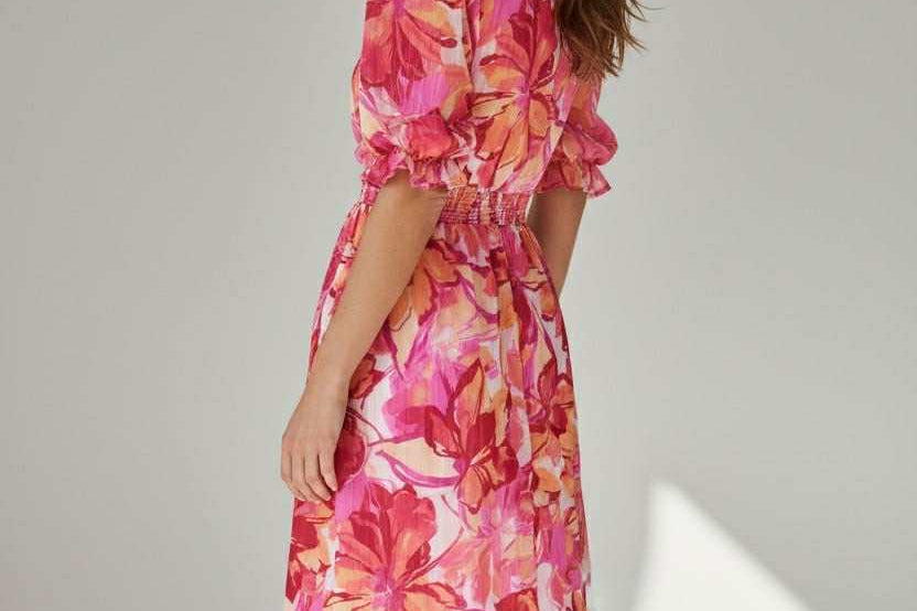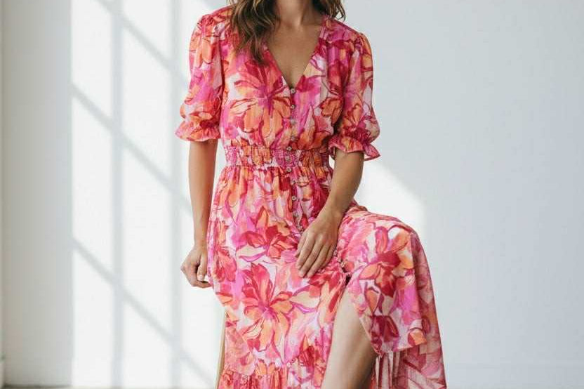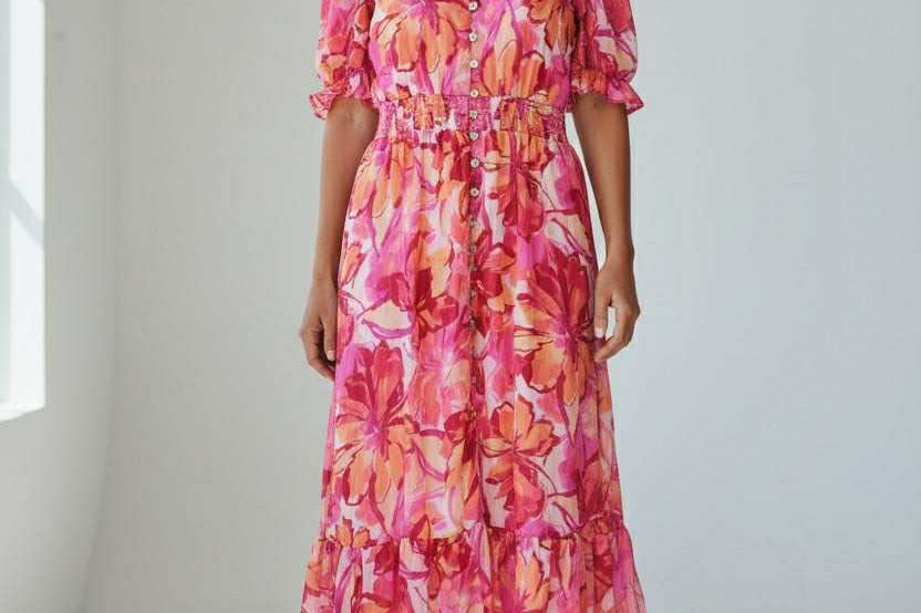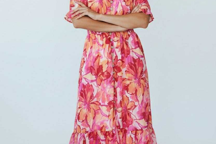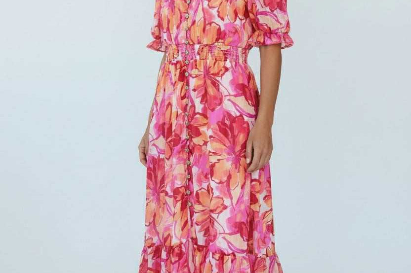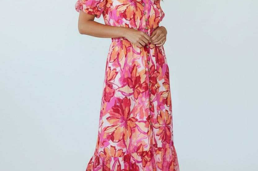 Sweet, soft, and made to charm. This floral midi features a dreamy mix of pink and coral hues with a flowy, tiered silhouette that moves effortlessly. Puff sleeves and a delicate button front add that signature Zi_Colection25 romance, while the cinched waist creates the perfect flattering shape. Designed for sunshine, brunch dates, and every moment you want to feel pretty.