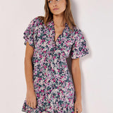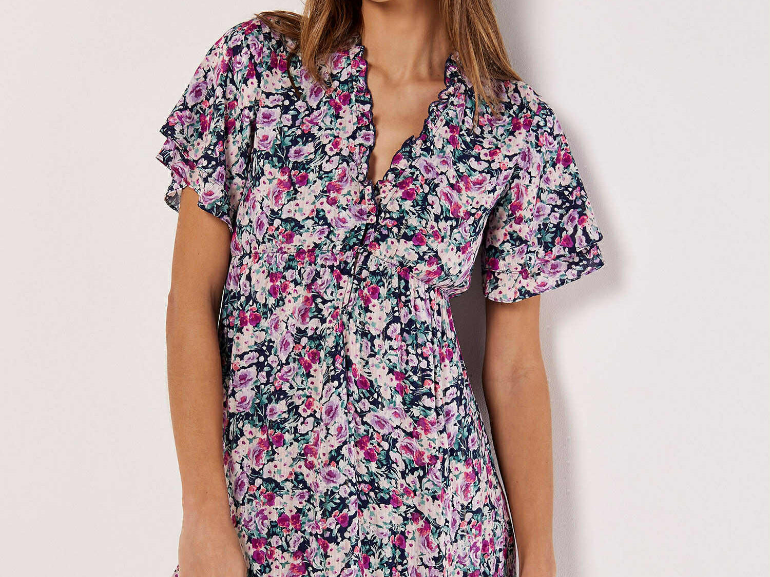 Look pretty in print with this mini dress that pairs soft chiffon fabric with shimmering threads for a touch of sparkle. Lined for comfort, it features an elastic waist for a great fit, a V-neckline with ruffle trim, and a button-down bodice. It's finished with angel sleeves and a tiered hem to create elegant movement. Style it with heeled wedges and a clutch for your next invite.