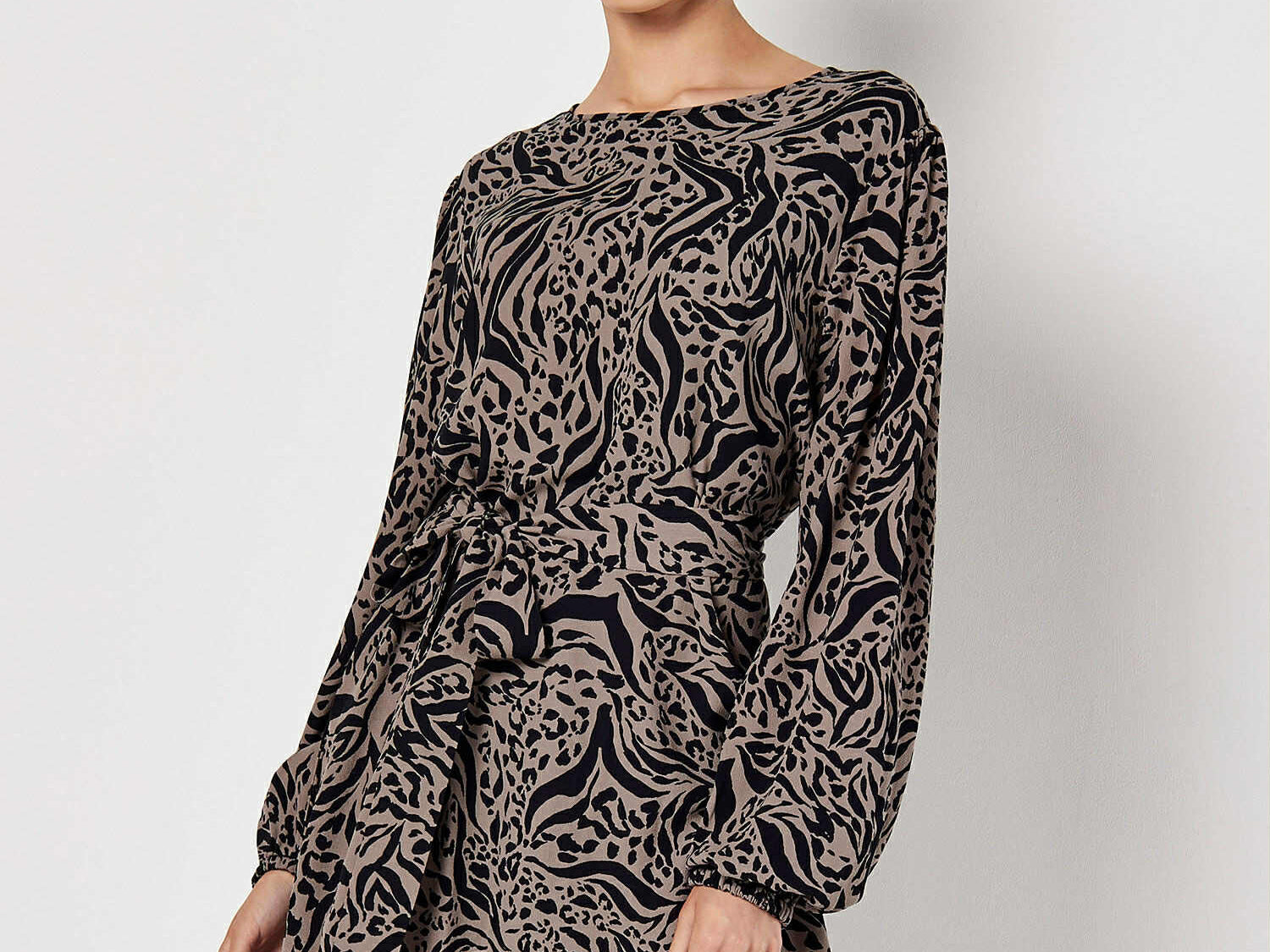 Work bold patterns into your weekly rotation with this zebra print mini dress. It features a figure-skimming shift shape, a boat neckline with a keyhole fastening at the nape, blouson sleeves, and a fabric belt to create definition. It's finished with practical side seam pockets. Complete the look with heeled leather boots.