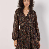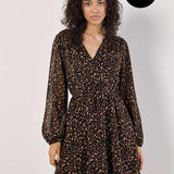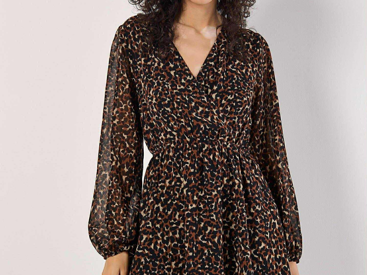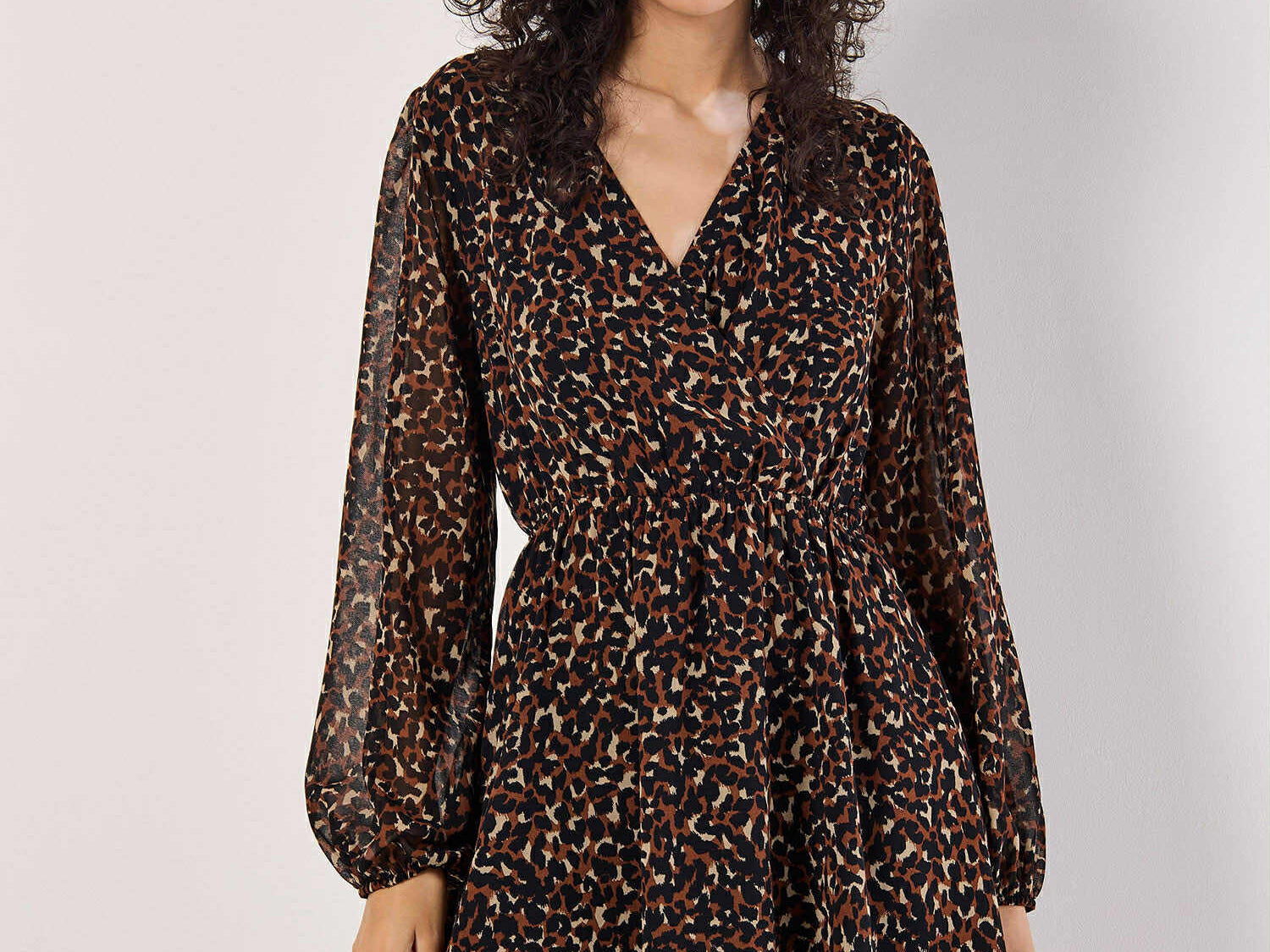 Lend a pop of animal print to your wardrobe with this chic mini dress. Crafted from lightweight chiffon and lined for comfort, it boasts a flattering wrap bodice, a plunging V-neckline, blouson sleeves, and an elastic waist for a comfortable fit. Style yours with heeled ankle boots for a polished finish.