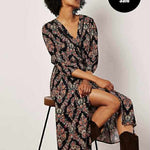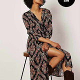 This must-have midi features an ornate paisley print designed to add timeless appeal to your wardrobe. In a flattering wrap design, it boasts a V-neckline with ladder trim, cropped blouson sleeves, and an elastic waist for comfort. Style yours with cowboy boots to take on the Western trend.