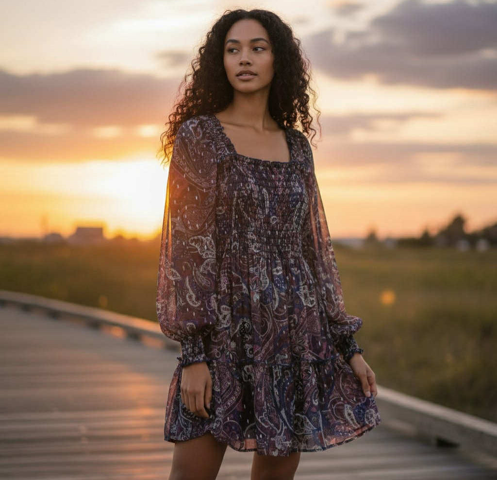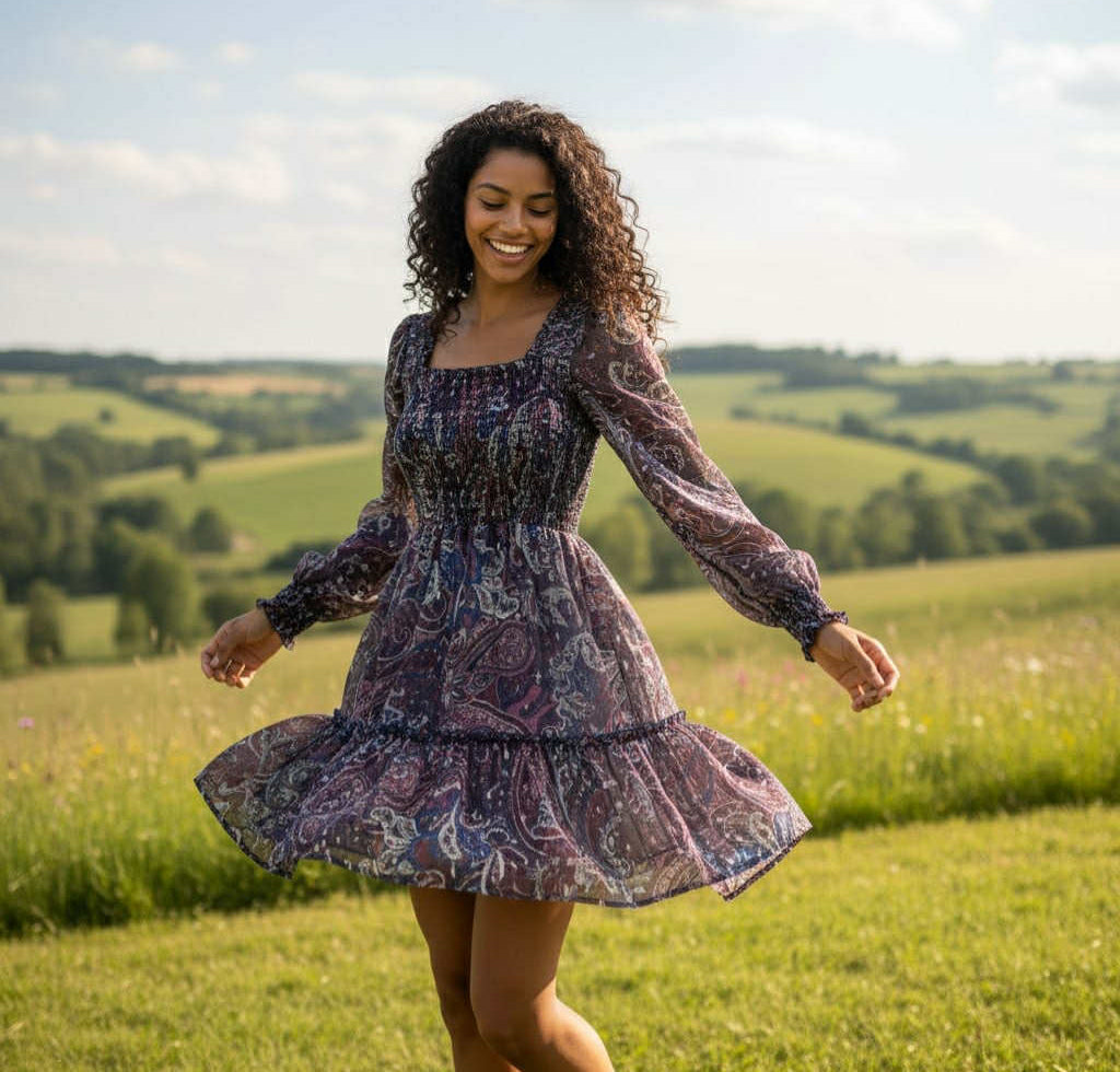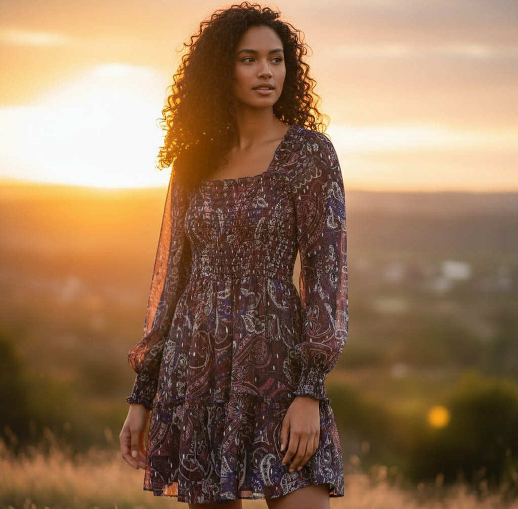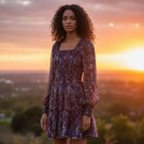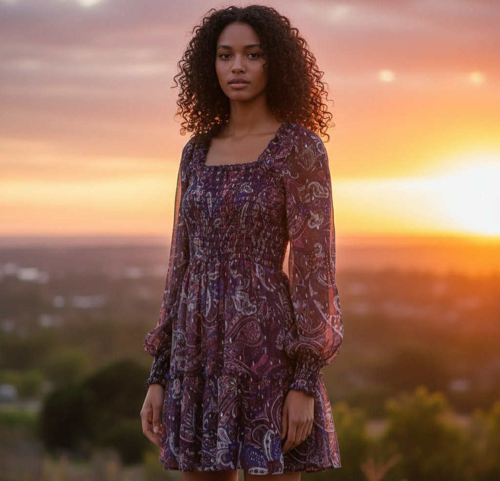 Chiếc váy này thật dễ thương! Với tông màu tím violet và tím nhạt đáng yêu, điểm xuyết họa tiết paisley, cùng thân áo nhún bèo ôm sát, chiếc váy mini dài tay này sẽ khiến mọi ánh nhìn phải ngoái nhìn! Đơn giản mà tinh tế, tô điểm thêm sức sống cho mùa lễ hội của bạn. Điểm đặc biệt là phần eo nhún bèo càng làm tăng thêm sự vừa vặn hoàn hảo cho mọi vóc dáng.