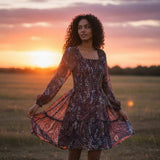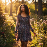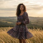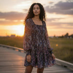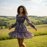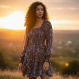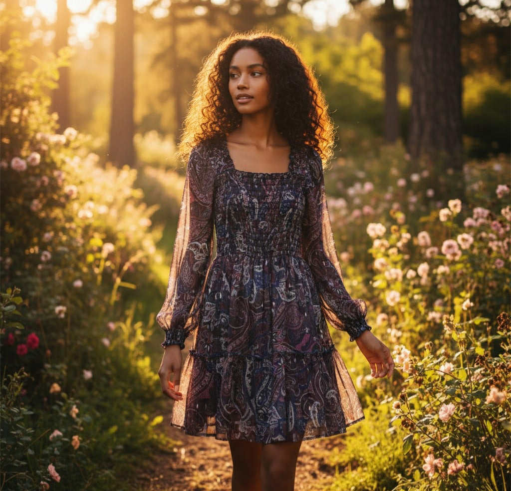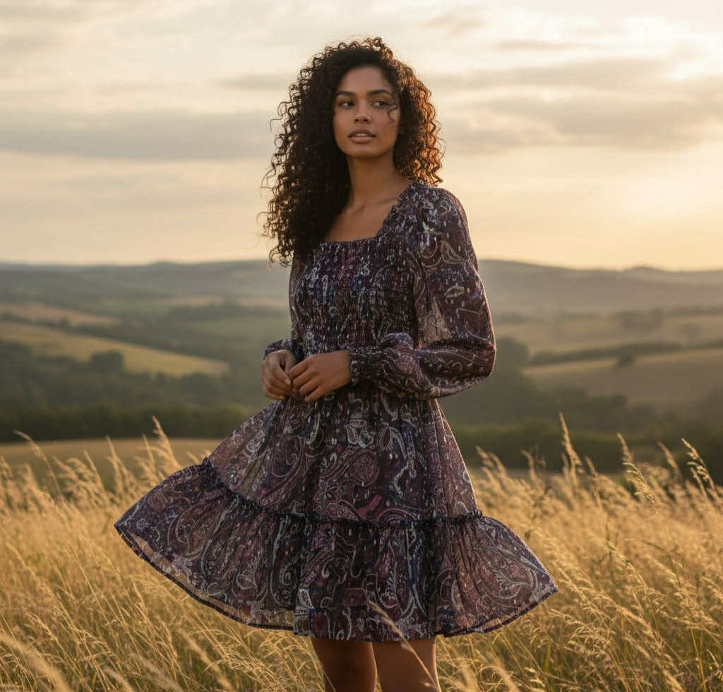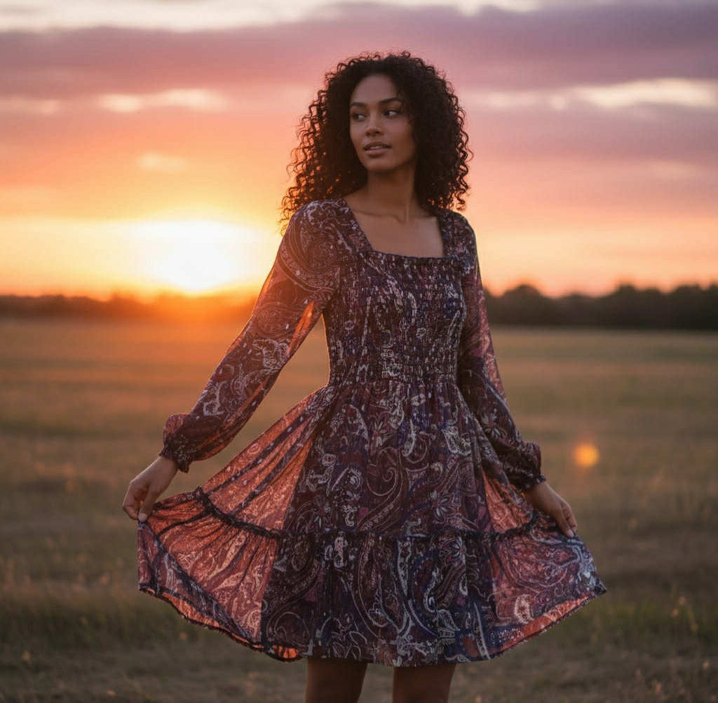 Chiếc váy này thật dễ thương! Với tông màu tím violet và tím nhạt đáng yêu, điểm xuyết họa tiết paisley, cùng thân áo nhún bèo ôm sát, chiếc váy mini dài tay này sẽ khiến mọi ánh nhìn phải ngoái nhìn! Đơn giản mà tinh tế, tô điểm thêm sức sống cho mùa lễ hội của bạn. Điểm đặc biệt là phần eo nhún bèo càng làm tăng thêm sự vừa vặn hoàn hảo cho mọi vóc dáng.