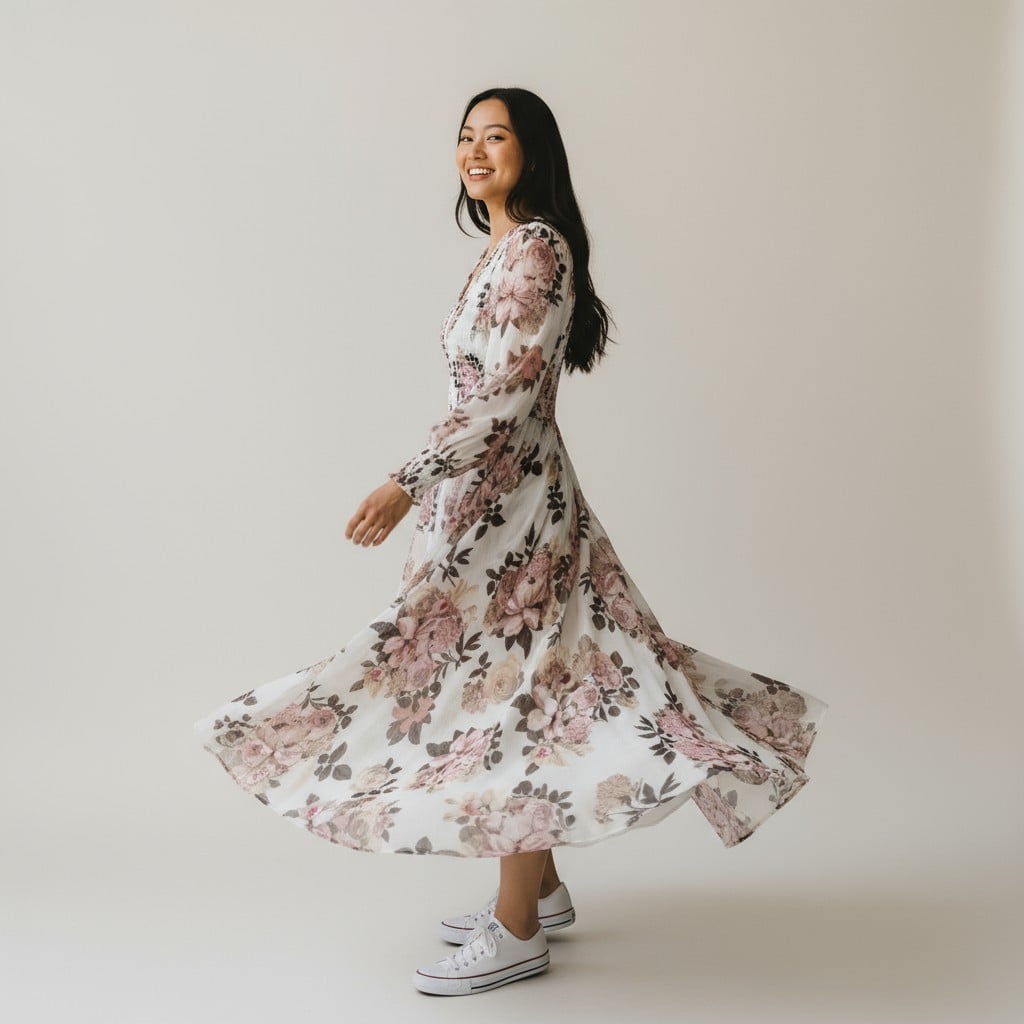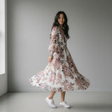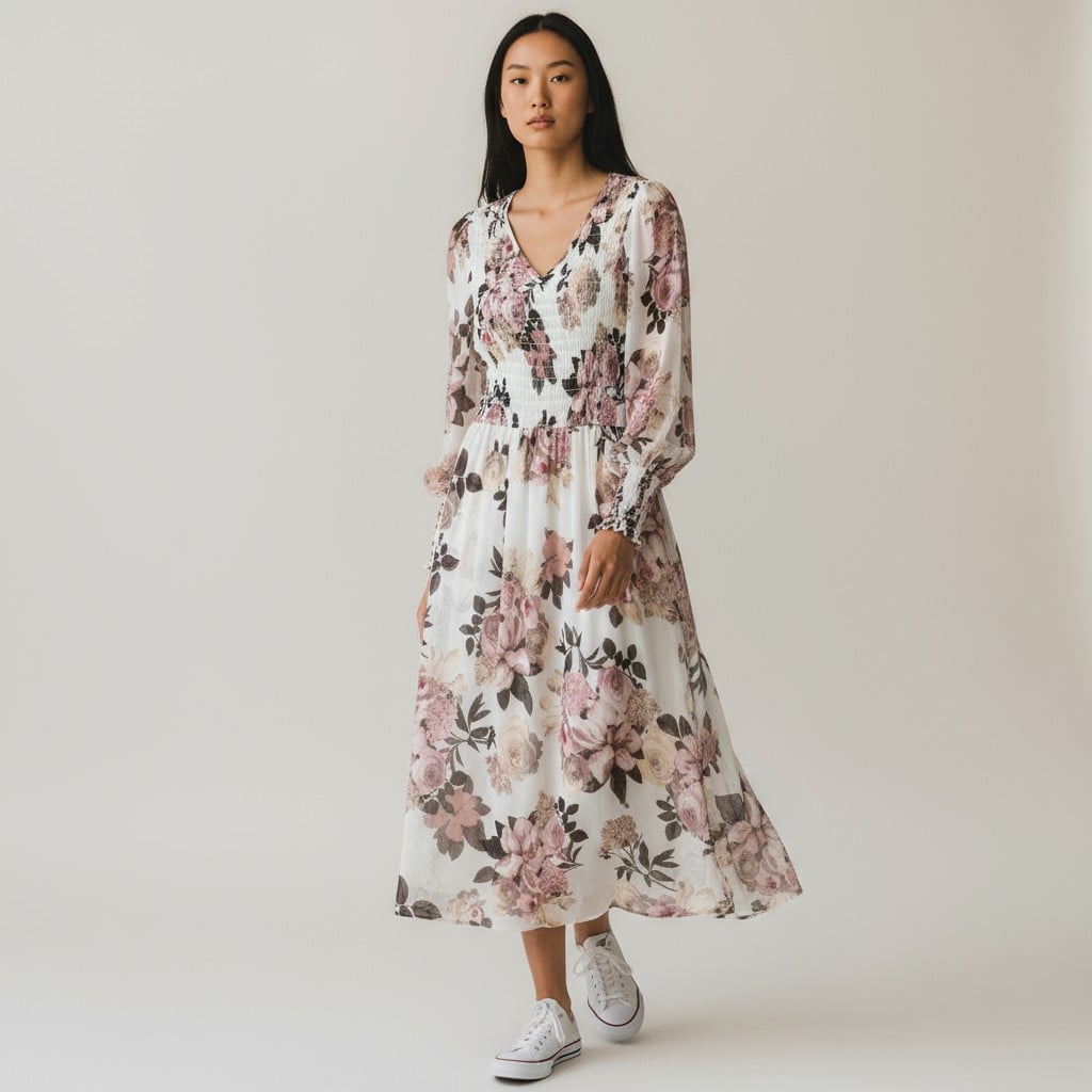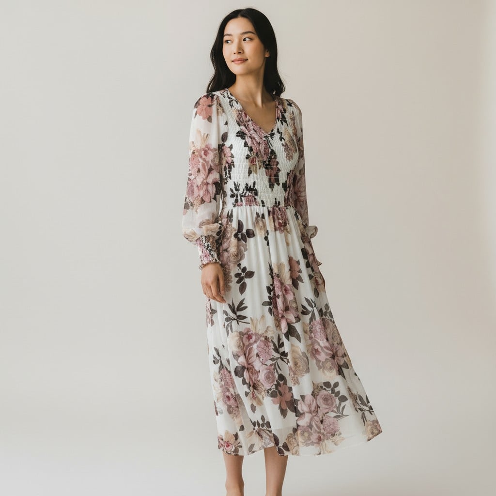 This midi dress is the perfect pick for all your weekend plans. Crafted from lightweight chiffon and lined for comfort, it boasts a smocked bodice for a defining fit, semi-sheer balloon long sleeves, and a skirt that falls in gentle tiers. Pair with heels and a sparkly clutch to complete the look.