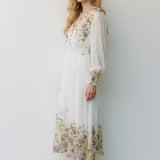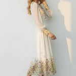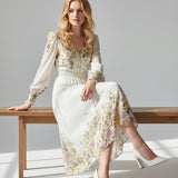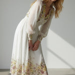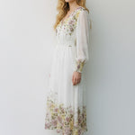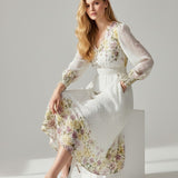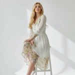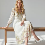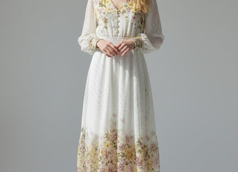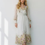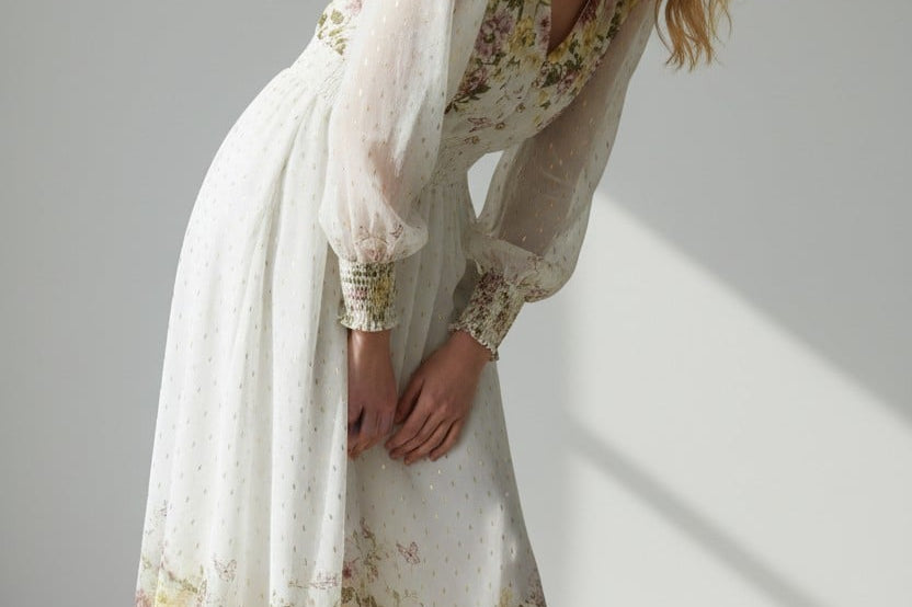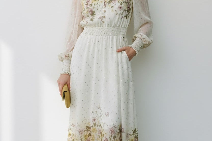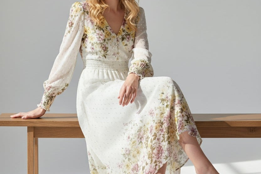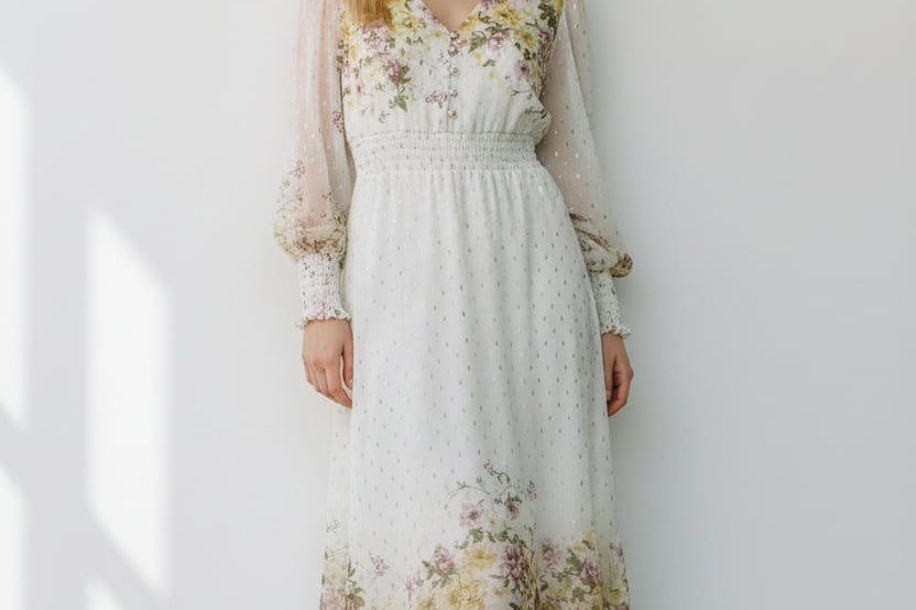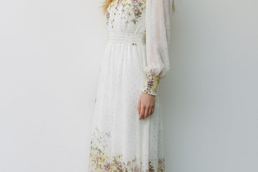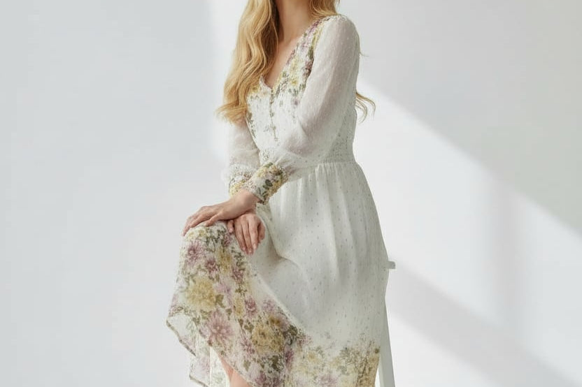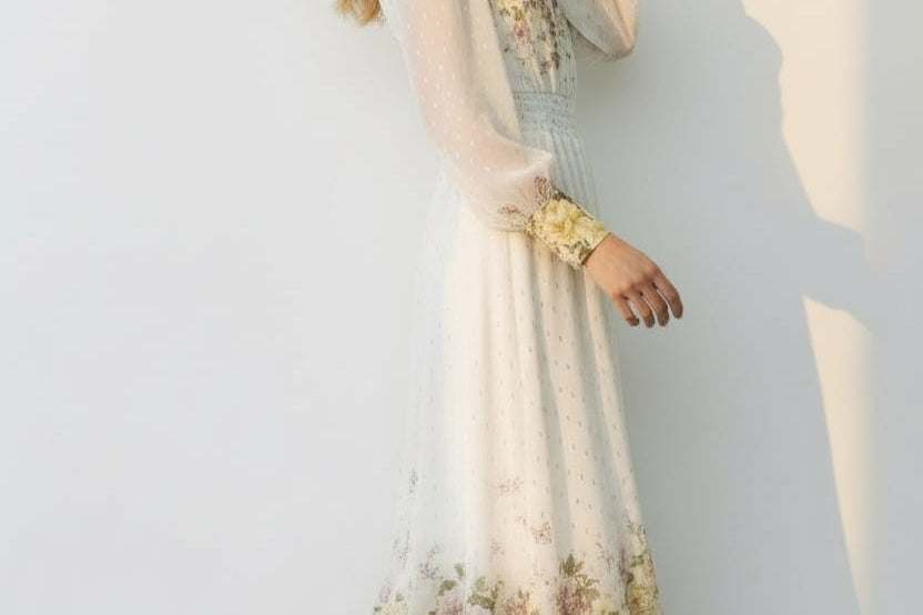 Meet the dress that turns every moment into something magical. The Golden Meadow Midi Dress features a romantic floral print that fades beautifully along the hem, paired with sheer dotted sleeves that add an airy, ethereal touch. The V-neckline and smocked waist create a flattering, feminine shape, while subtle details—like delicate sleeve cuffs and effortless movement—elevate the entire look. Perfect for garden parties, weddings, and the days you want to feel undeniably graceful. Style it with strappy heels and a soft clutch for a dreamy, polished finish.