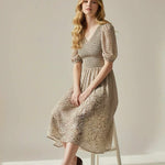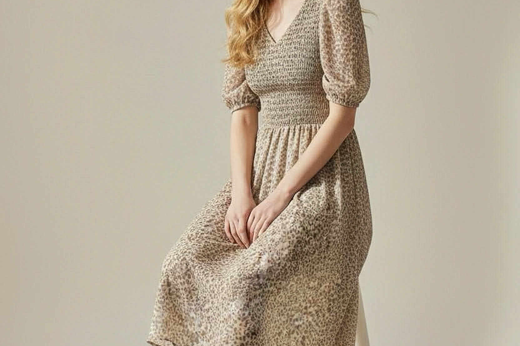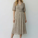 Meet the dress that makes every moment feel softer. Honeydew Haze Dress features a delicate allover print, shirred detailing through the bodice for that ultra-flattering fit, and a gently gathered midi skirt that sways with every step. Finished with airy puff sleeves and a timeless V-neckline, it’s the perfect blend of romantic and wearable—your new go-to for brunches, weekend escapes, and everything in between.