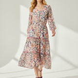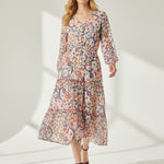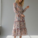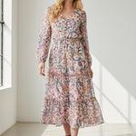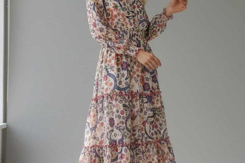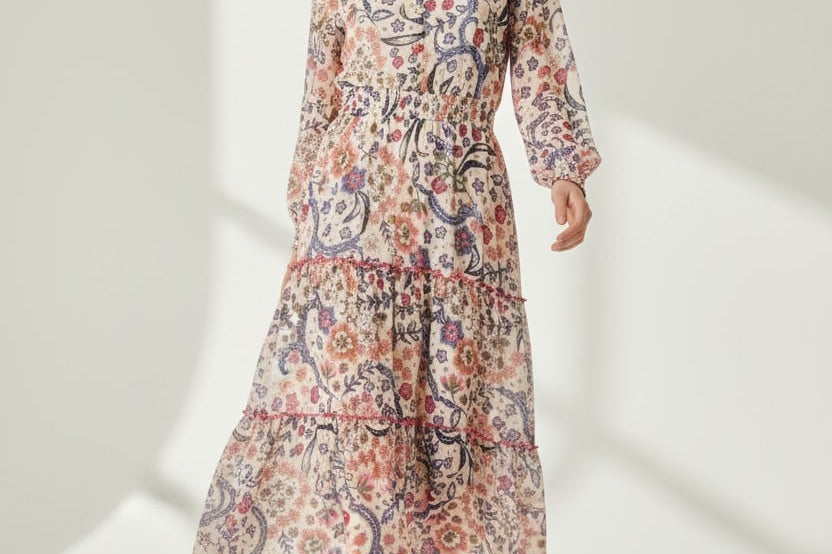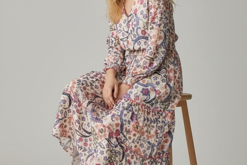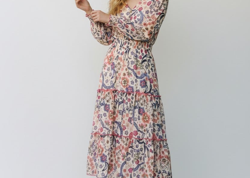 Bohemian with a polished edge. The Isadora Patchwork Dress mixes soft florals and paisley motifs in a dreamy mosaic print. A smocked bodice, long sleeves, and a floating tiered skirt give this piece an effortlessly luxe feel—made for weekends away or golden-hour gatherings.