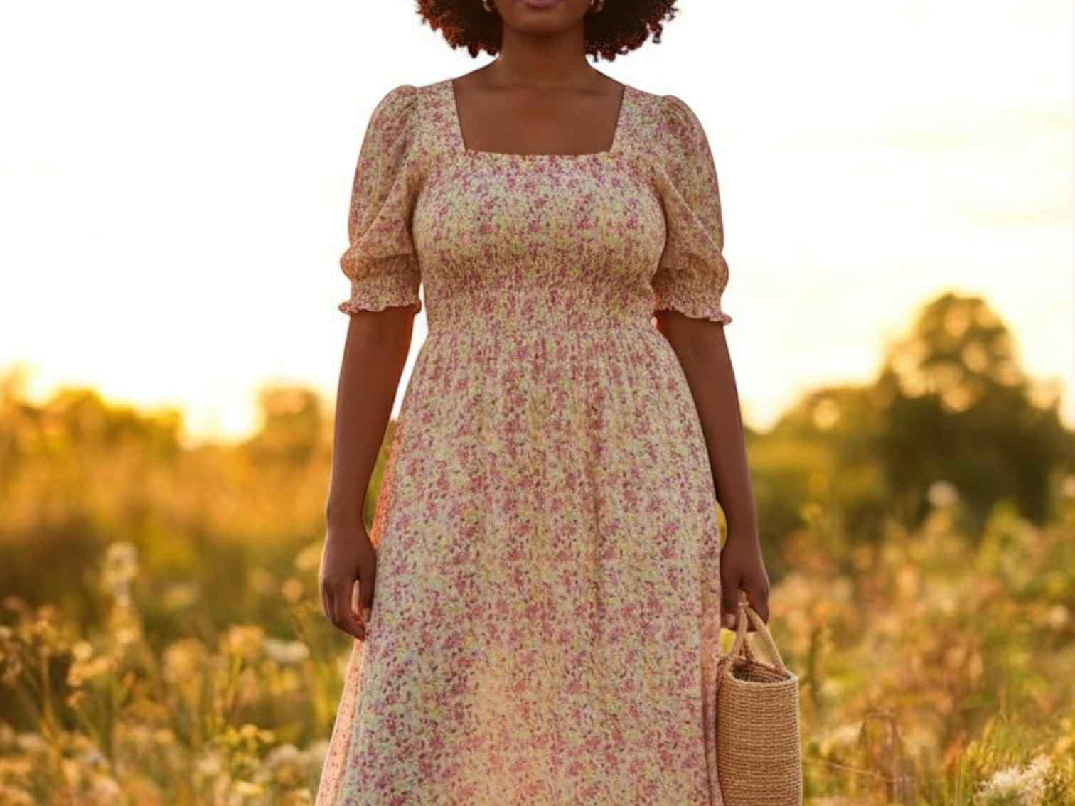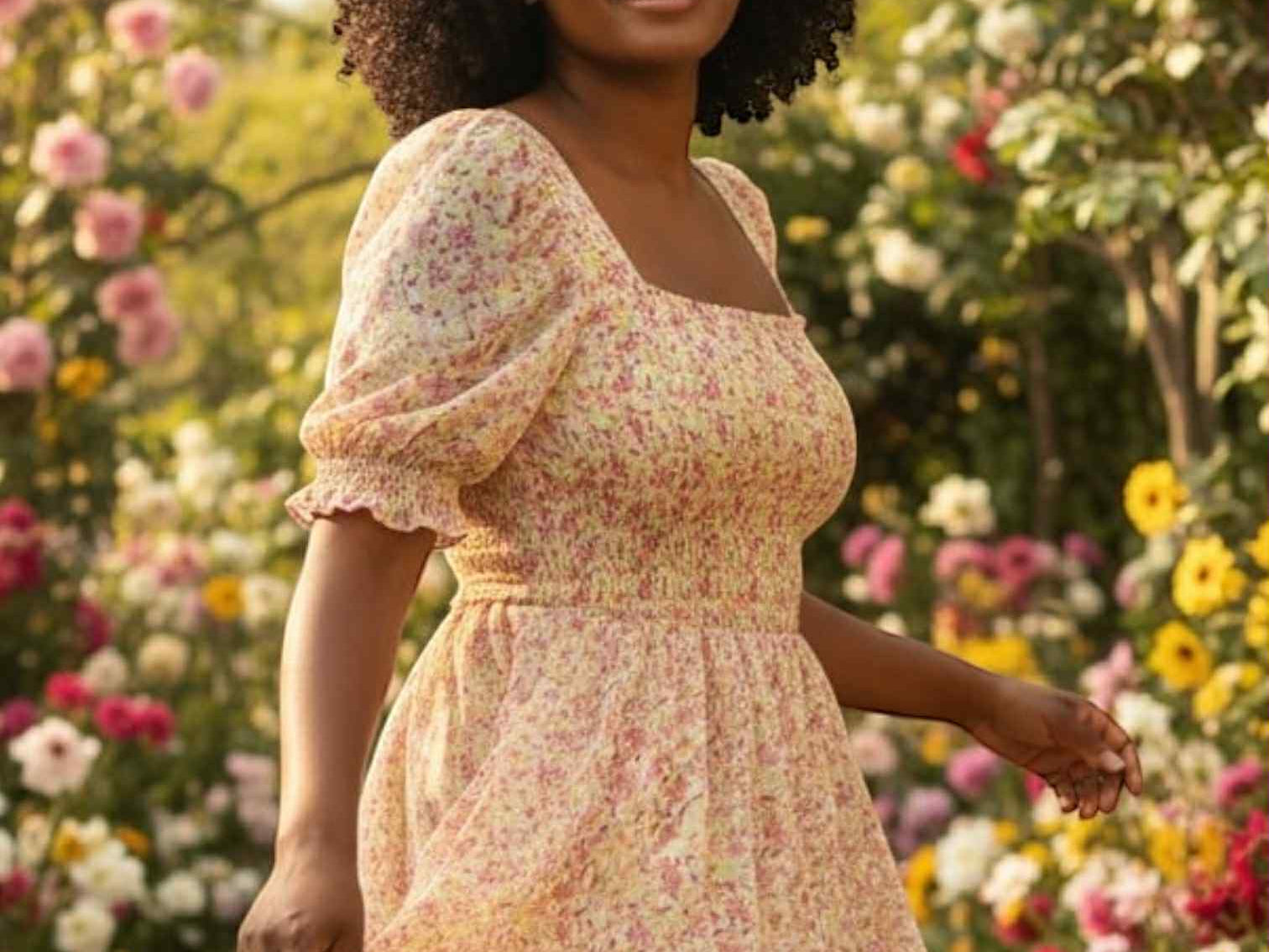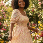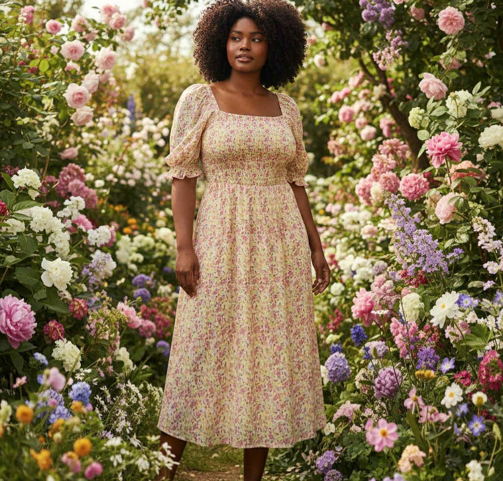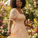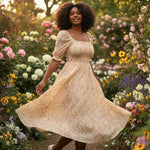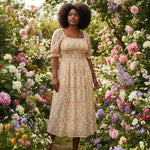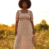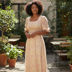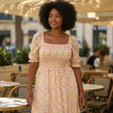 Get in the mood for Spring/Summer with this charming floral printed shirred dress! The all-over large scale floral print, shirred bust, and square neck create a romantic and playful look. Short puff sleeves with elasticated cuffs add a touch of flair, while the midi length offers a stylish silhouette. Made from a soft fabric, this dress is perfect for sunny days. Pair with sandals and a denim jacket for a fresh and feminine ensemble.