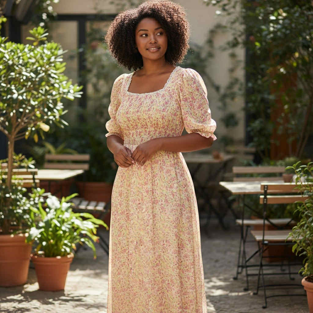 Square Neckline, Short Puff Sleeve, Detail Shirred, Design Midi Length