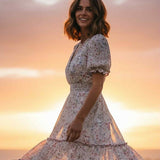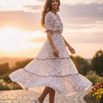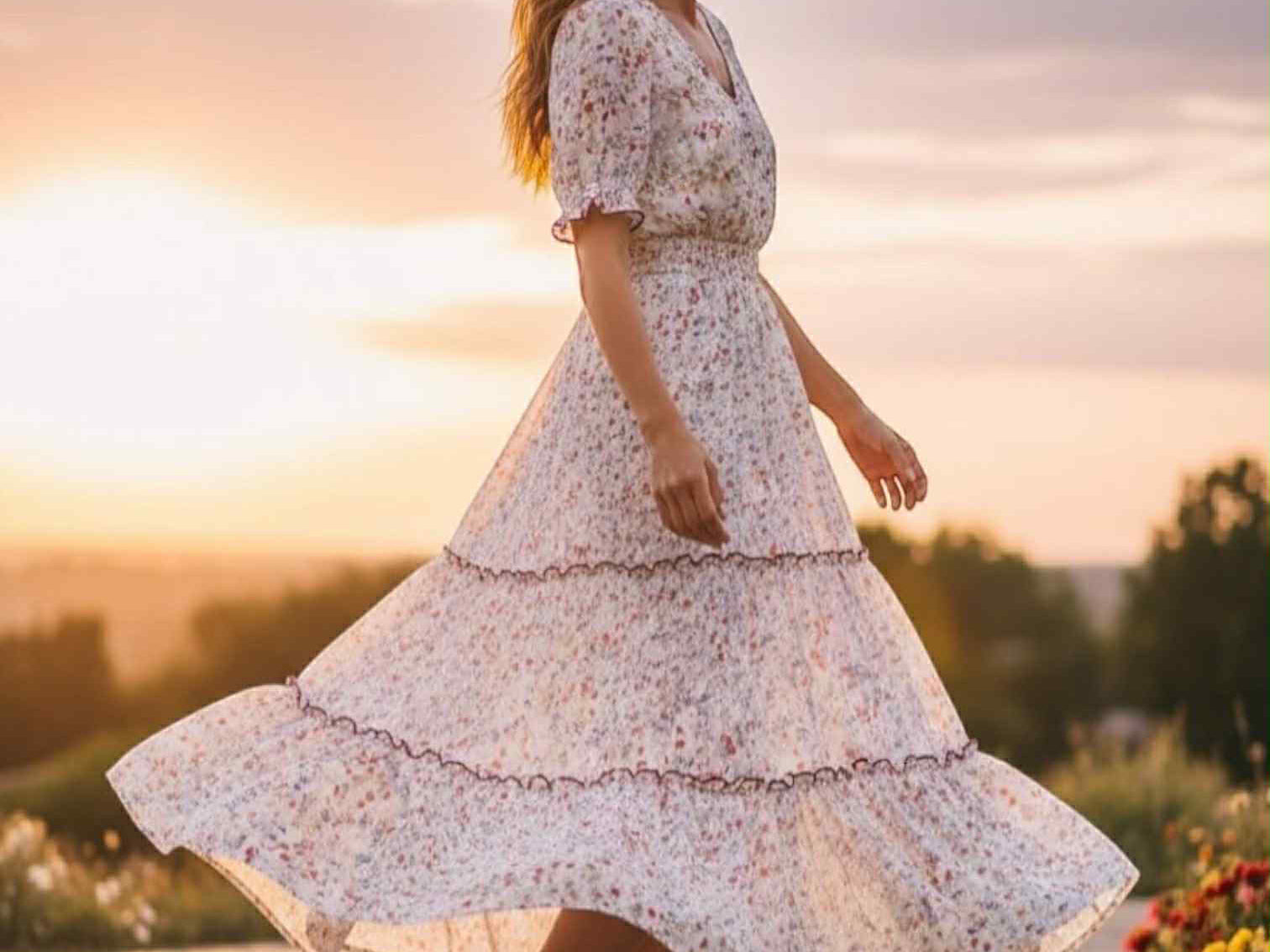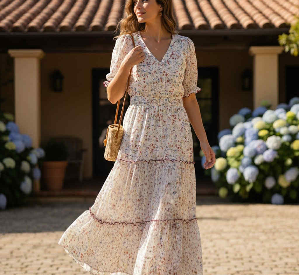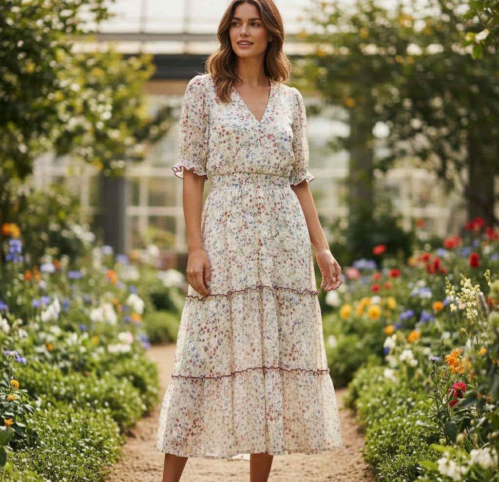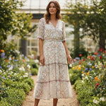 Stunning ditsy palette with modest V-Neck cut and trim. Beautifully structured waist line with elegant hems. Three-quarter style with easy long sleeves and moderate length. Ideal for all your parties, outings and special occasions this season. Soft fabric gives you added comfort and style.