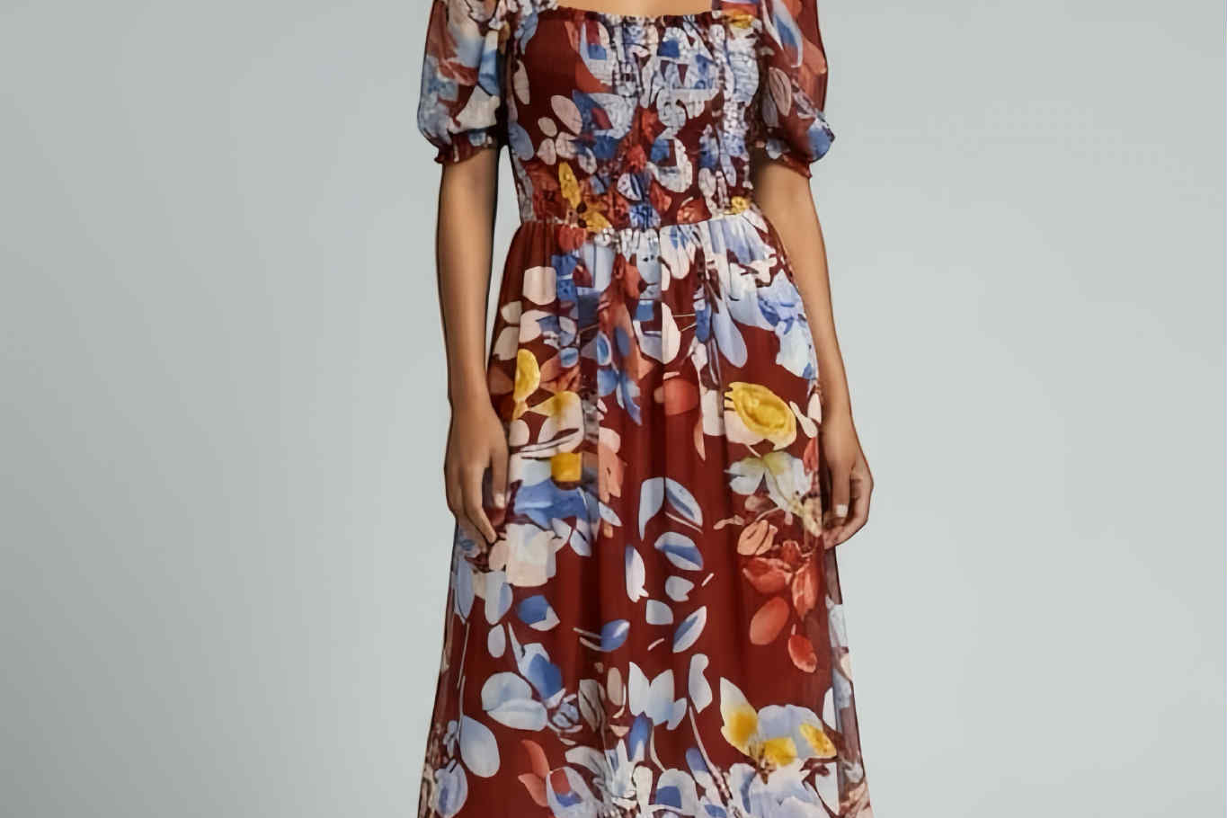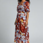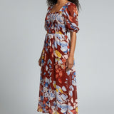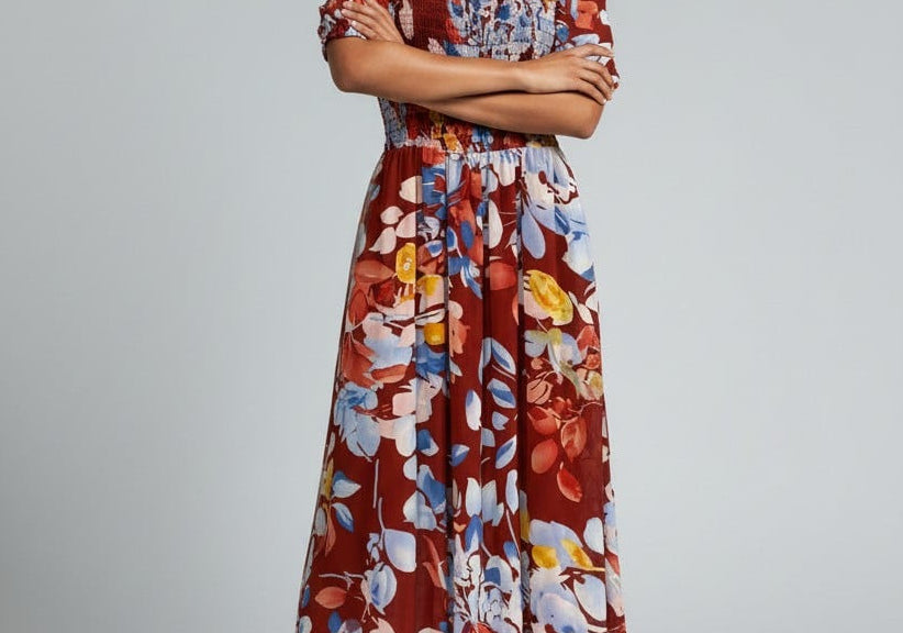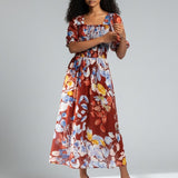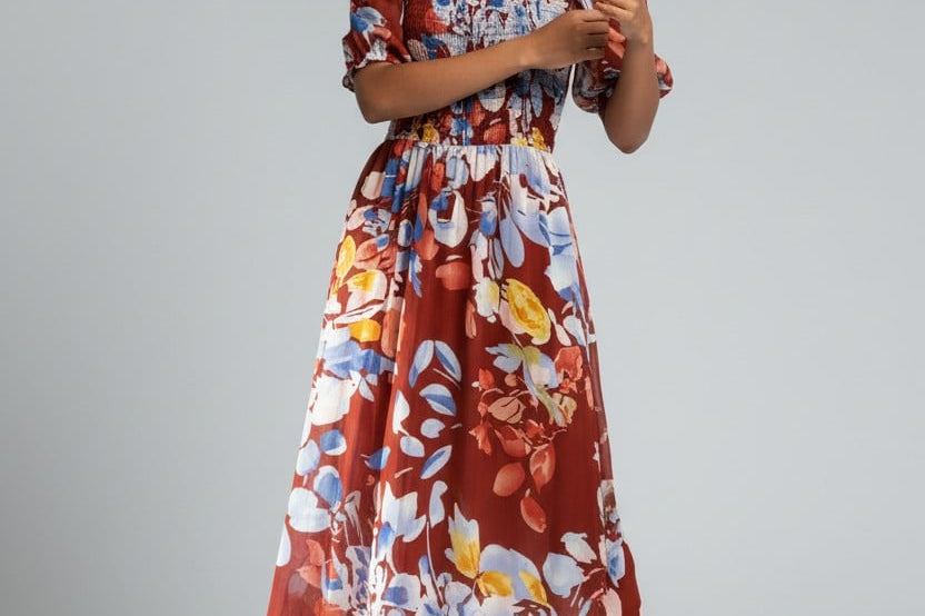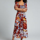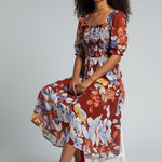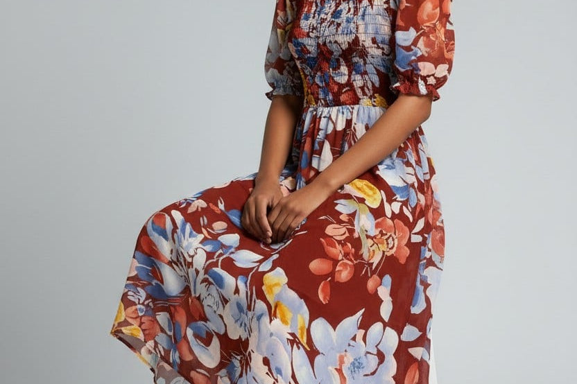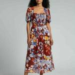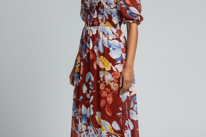 Vibrant, romantic, and made to stand out—the Fireside Blossoms Dress brings bold energy to your modern feminine wardrobe. Designed in a rich rust base with painterly florals in blues, yellows, and soft neutrals, this midi is the perfect blend of dreamy and dramatic. The smocked bodice creates a flattering, easy fit, while the puff sleeves and square neckline add a chic, vintage-inspired touch. Finished with a breezy, movement-friendly skirt, it’s the dress you reach for when you want effortless impact—brunch to date night and everything in betwee