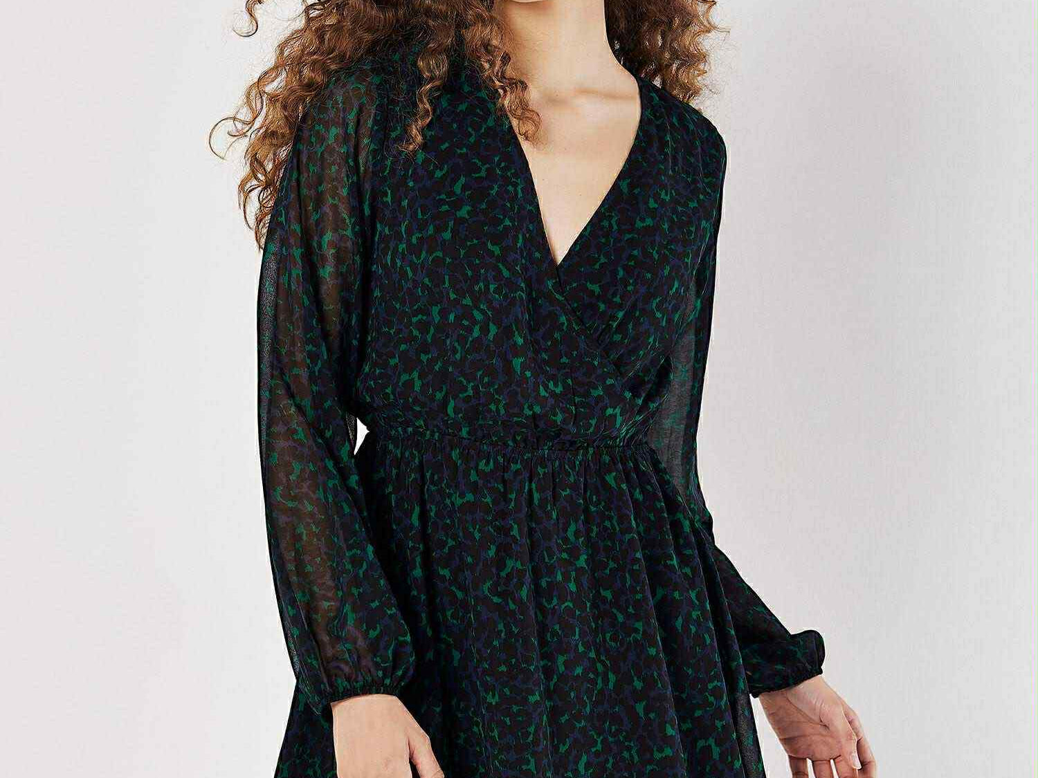 Lend a pop of animal print to your wardrobe with this chic mini dress. Crafted from lightweight chiffon and lined for comfort, it boasts a flattering wrap bodice, a plunging V-neckline, blouson sleeves, and an elastic waist for a comfortable fit. Style yours with heeled ankle boots for a polished finish.
