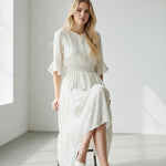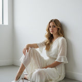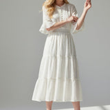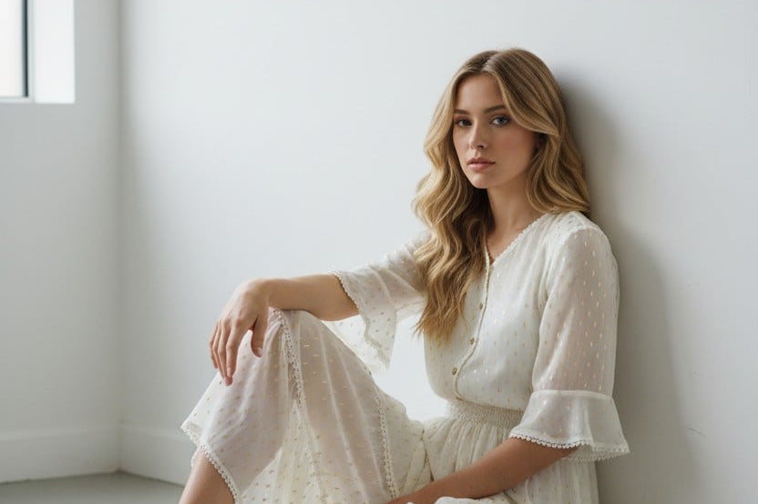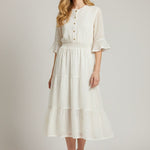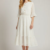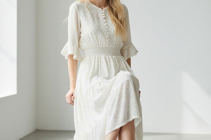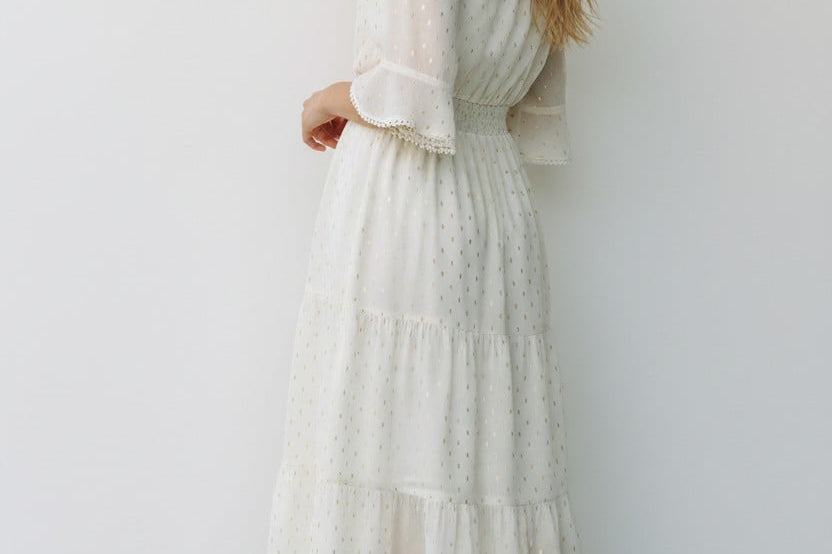 Light, airy, and beautifully understated, this midi dress brings pure romance to your wardrobe. Designed with delicate gold dot detailing, soft ruffled sleeves, and a button-front bodice, it’s the definition of effortless charm. The smocked waist creates a flattering, feminine silhouette, while the tiered skirt adds gentle movement with every step. A timeless look made for brunch dates, garden parties, and your prettiest moments.