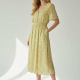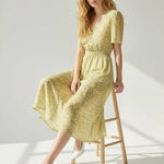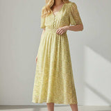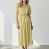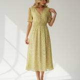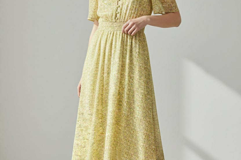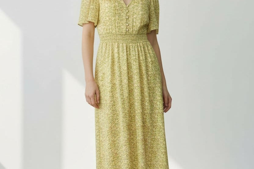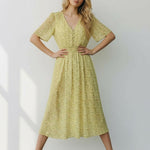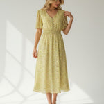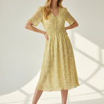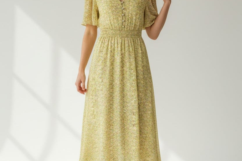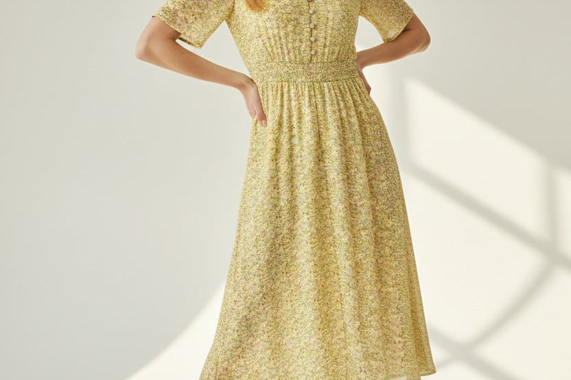 The Sunlit Meadow Midi Dress brings effortless romance to your everyday moments. Designed with a soft floral print and a sun-washed yellow hue, it features a flattering V-neckline, delicate front buttons, and fluttery short sleeves that add just the right amount of movement. A smocked waist defines the silhouette while keeping things comfortable and easy to wear. Perfect for brunch, garden strolls, or any warm day that calls for something sweet and feminine. Pair it with heels or simple sandals for an instantly polished look.